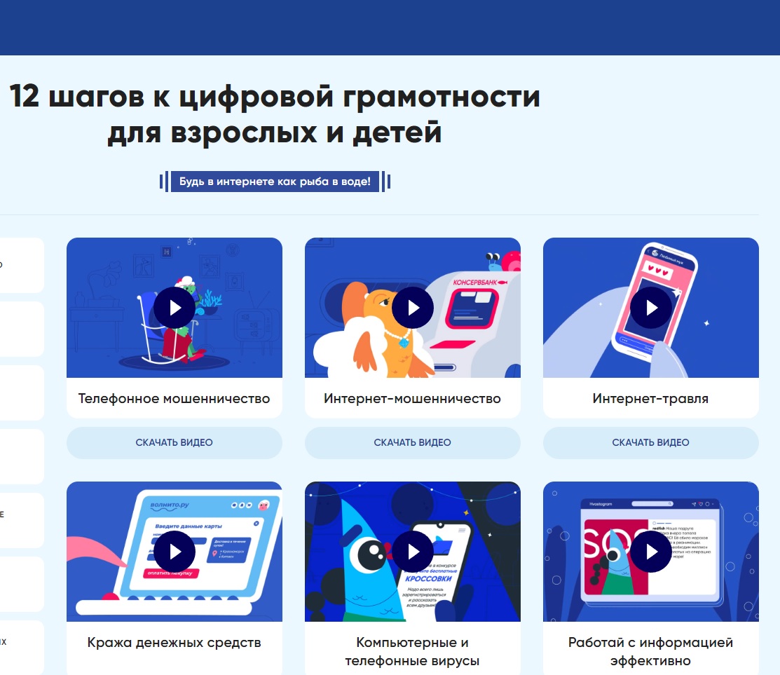 На сайте представлены 12 обучающих мультипликационных роликов, вместе с героями, жителями подводного мира. На простых и понятных жизненных примерах ребята научаться азам цифровой грамотности.