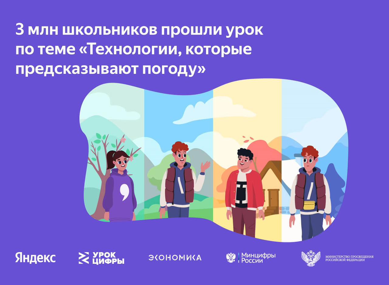 13.02.2023Около 3 млн учеников прошли «Урок цифры»Урок о технологиях, предсказывающих погоду, прошли около 3 млн школьников из 135 стран. В России самыми активными были участники из Белгородской, Оренбургской, Омской, Магаданской, Воронежской, Новосибирской, Орловской, Самарской, Ростовской области, Республики Мордовия, Чукотского, Ямало-Ненецкого, Еврейской АО, а также Камчатского и Забайкальского края. Всероссийский образовательный проект «Урок цифры» реализуется в поддержку федерального проекта «Кадры для цифровой экономики» национального проекта «Цифровая экономика» и призван способствовать ранней профориентации школьников в сфере ИТ.Яндекс проводил «Урок цифры» на тему «Технологии, которые предсказывают погоду» с 16 января по 5 февраля. Ученики узнали, за что в прогнозировании отвечает искусственный интеллект, а за что — человек, сколько разных специалистов участвует в составлении прогнозов и почему даже самые умные ИИ-модели ошибаются.«Урок цифры» проходит с 2018 года в рамках национального проекта «Цифровая экономика». Занятия знакомят школьников с IT-профессиями и помогают определиться, чем им самим интересно заниматься в будущем. Дети видят, на каких технологиях построены разные сервисы — в том числе те, которыми они пользуются каждый день.«Я считаю, что игра – один из лучших способов познакомить школьников с миром ИТ. Именно поэтому "Урок цифры" проводится в виде увлекательных онлайн-игр для учащихся всех классов. На тематических тренажерах ребята изучают алгоритмы и работу искусственного интеллекта, кодирование и технологии машинного обучения, управление проектами и обеспечение безопасности в онлайне», — подчеркнула директор Департамента координации программ и проектов Татьяна Трубникова.«Мы подготовили интерактивный урок, на котором дети узнали, как выглядит настоящая метеорологическая станция и какие технологии помогают предсказывать погоду. А ещё сотрудники Яндекс Погоды рассказали, сколько видов снежинок существует, бывают ли перламутровые облака, почему небо голубое и как рождается ветер. Думаю, нам удалось заинтересовать школьников всех возрастов и показать, что прогноз погоды — это не что-то скучное из телевизора, а современная область, в которой нужны самые разные специалисты», — поделился директор по развитию образования Яндекса Сергей Бражник.«Наш проект «Урок цифры» за время своей работы познакомил миллионы школьников с IT-профессиями, а ещё расширил кругозор по многим другим предметам и сферам. Например, возможности искусственного интеллекта совершенно по-новому были раскрыты через метеорологическое прогнозирование — это прикладная тема, интересная каждому. У «Яндекса» получилось объяснить достаточно сложную тему доступно и понятно: в итоге почти 3 млн школьников по всей стране прошли урок. Отличный результат и, как всегда, слаженная качественная работа!» - комментирует генеральный директор АНО «Цифровая экономика» Сергей Плуготаренко.Справочно:Проект «Урок цифры» реализуется в поддержку федерального проекта «Кадры для цифровой экономики». Занятия на тематических тренажерах проекта проводятся в виде увлекательных онлайн-игр для трех возрастных групп: учащихся младшей, средней и старшей школы. Методические материалы уроков остаются в доступе на сайте проекта и охватывают широ